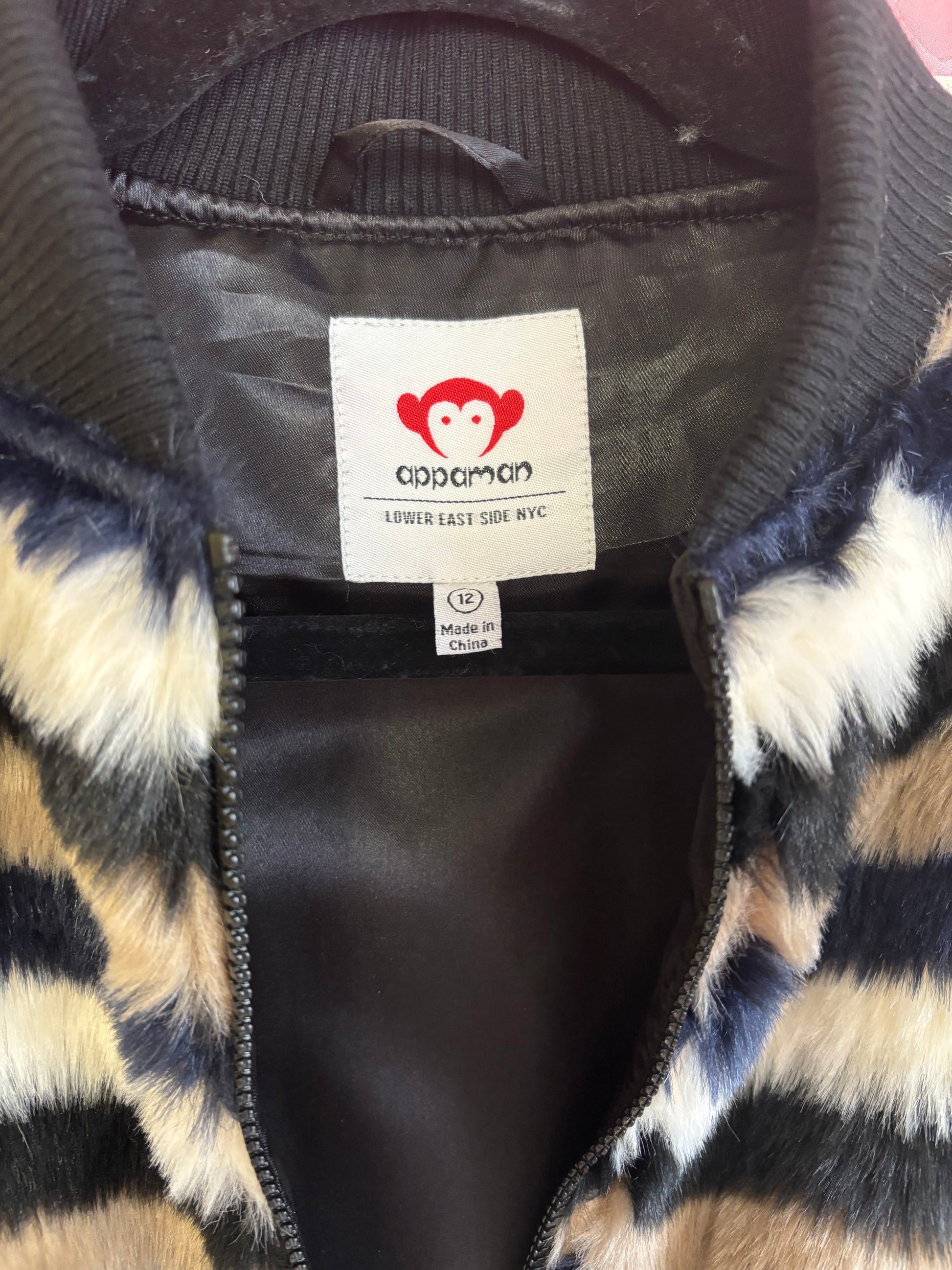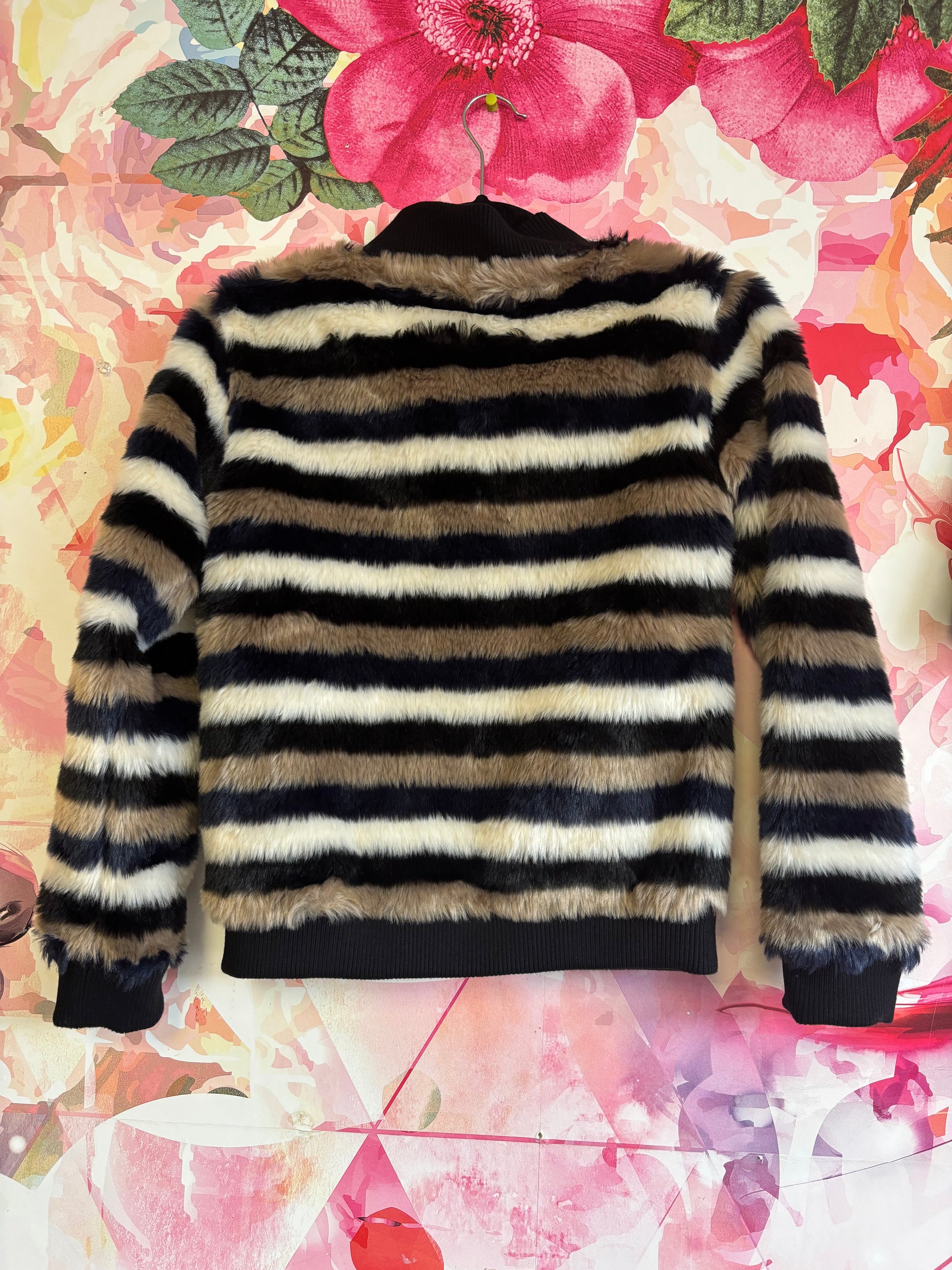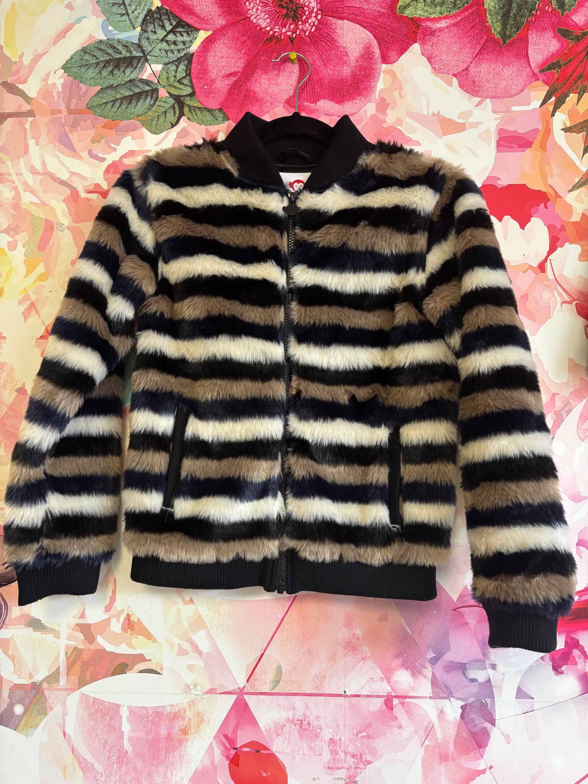 Appaman Nikki Bomber jacket. Faux fur striped black/tan/cream/blue. Size 12.