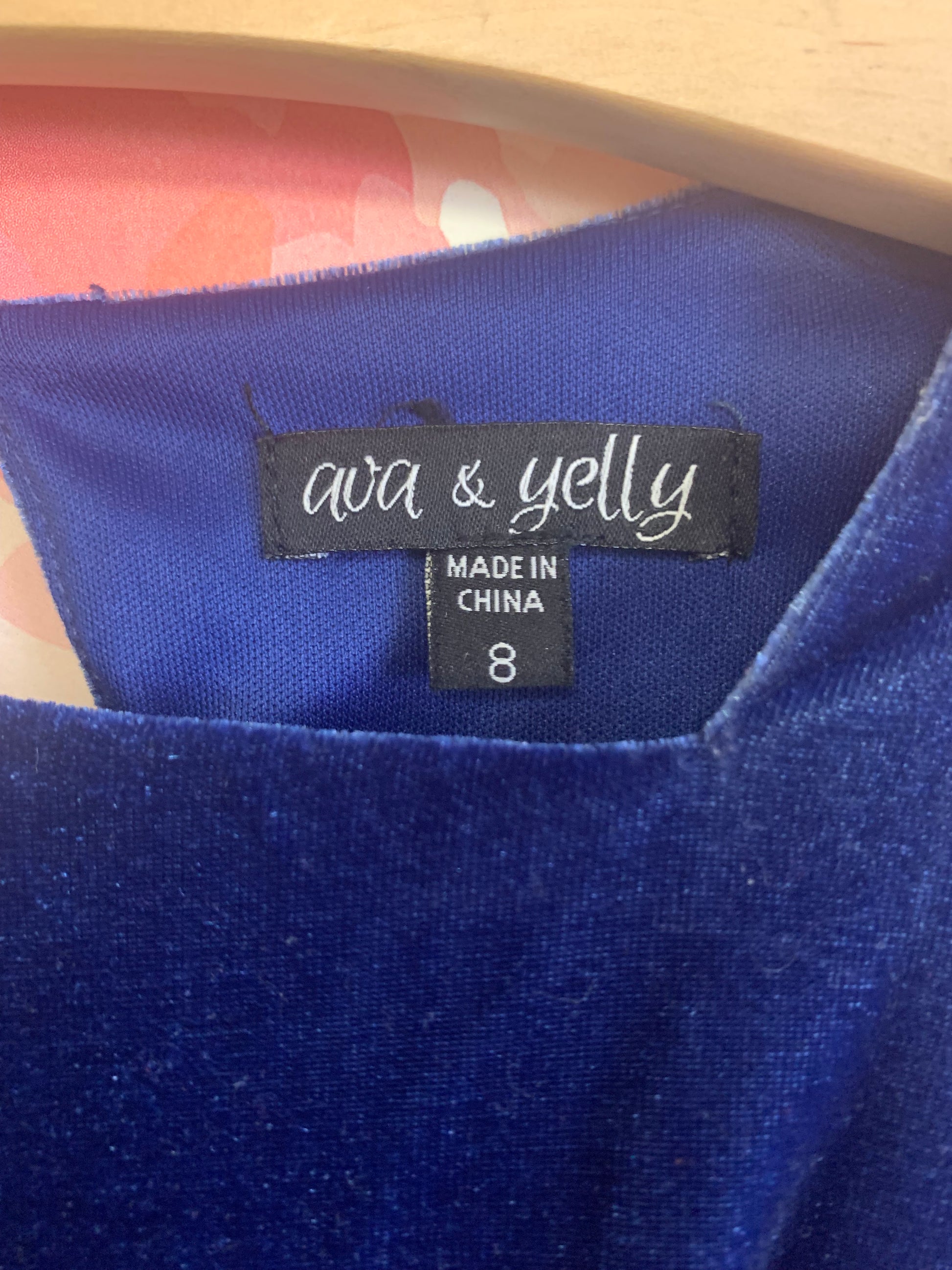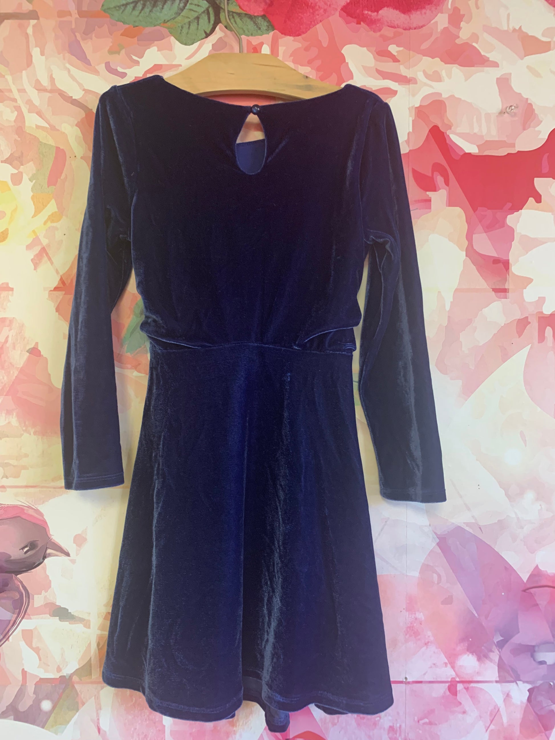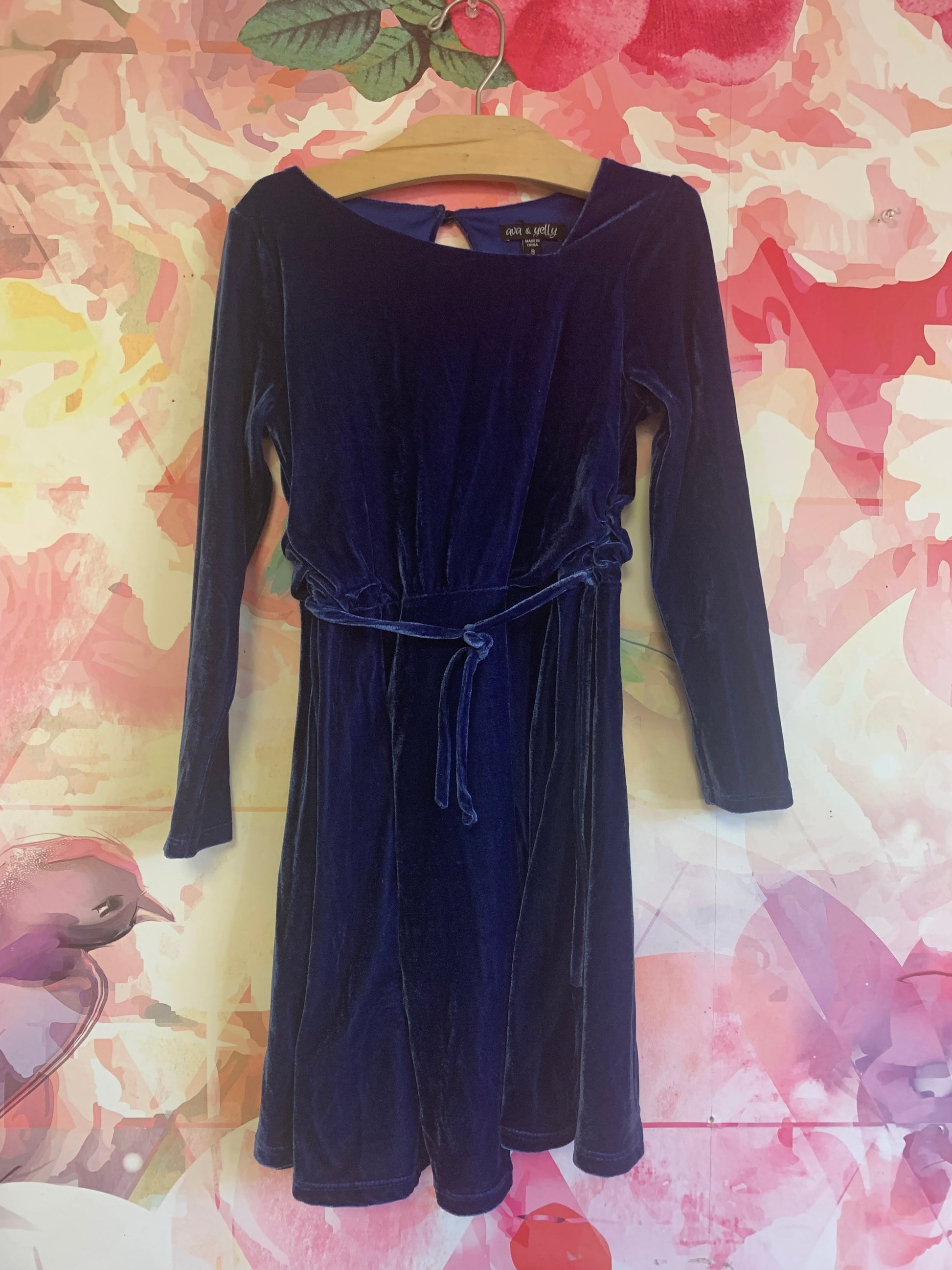 Ava & Yelly blue velour long sleeve dress with waist tie. Asymmetrical neckline. Size 8