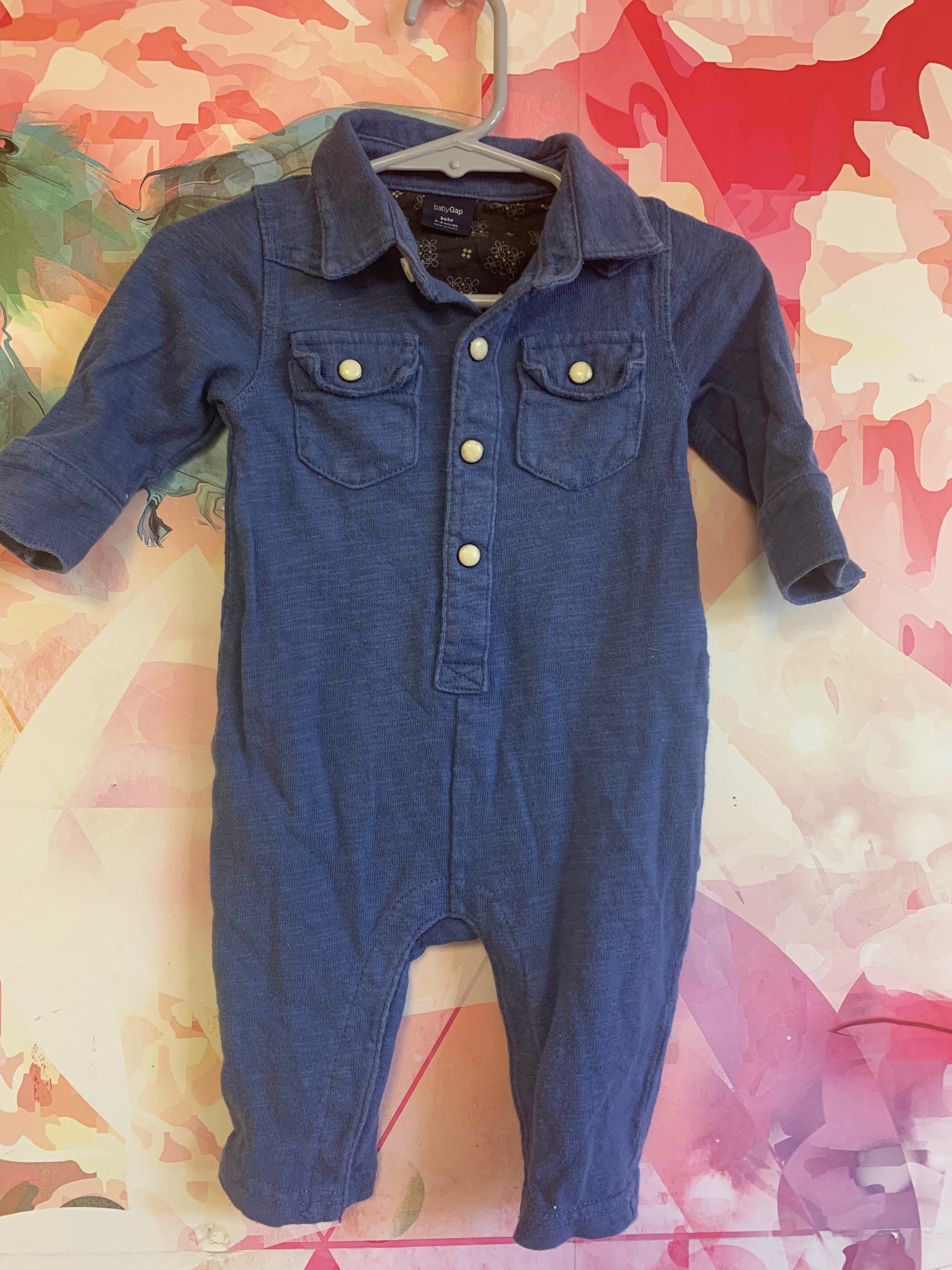 Baby Gap blue romper with pearl snaps and collar. Size 3-6m