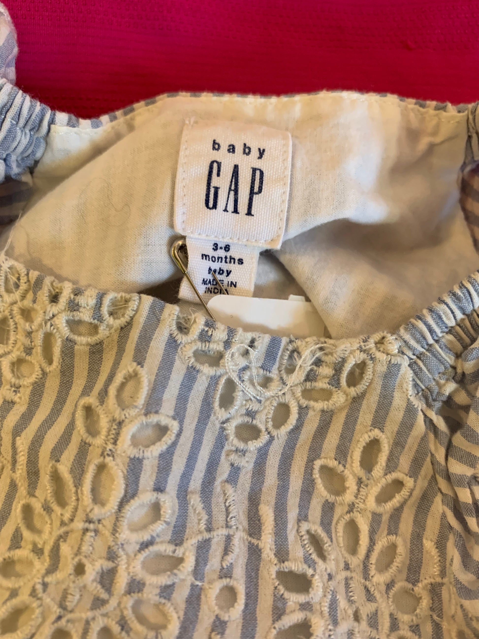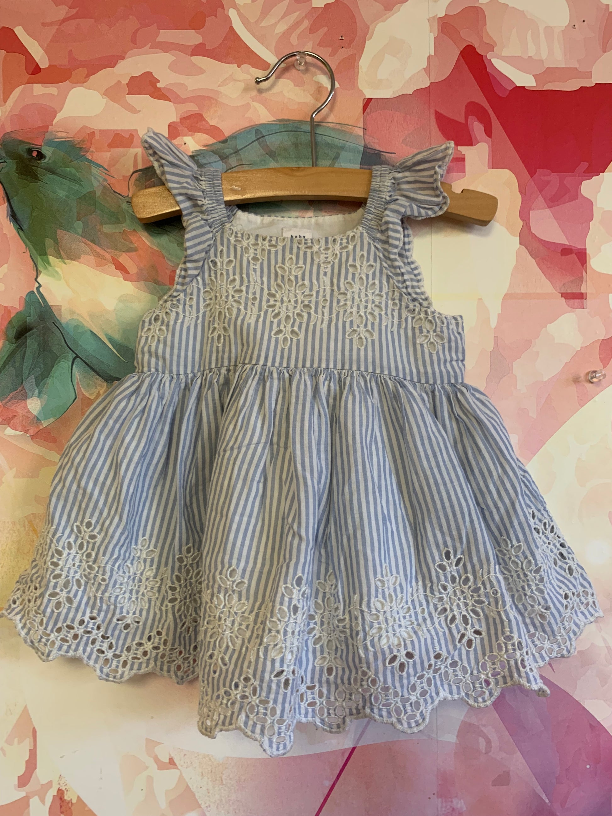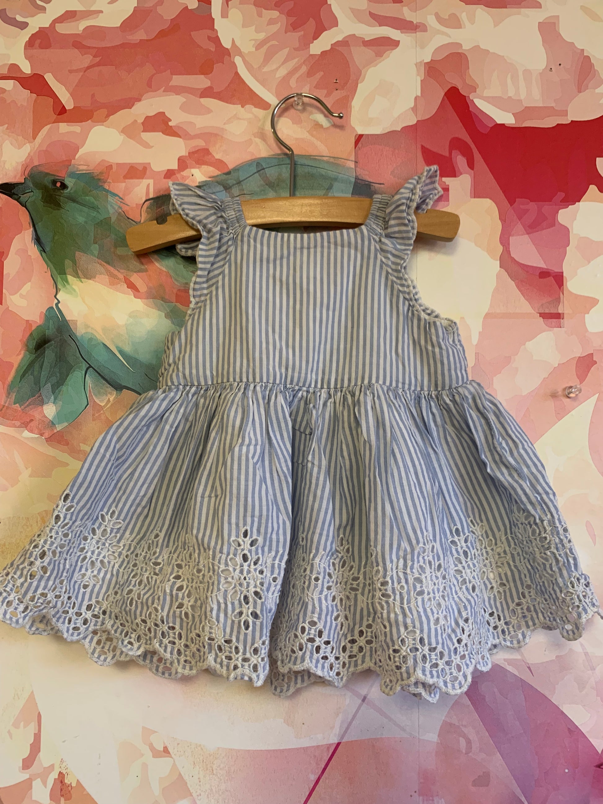 Baby Gap blue/white stripe sleeveless dress with white eyelet design. Fully lined. Size 3-6m