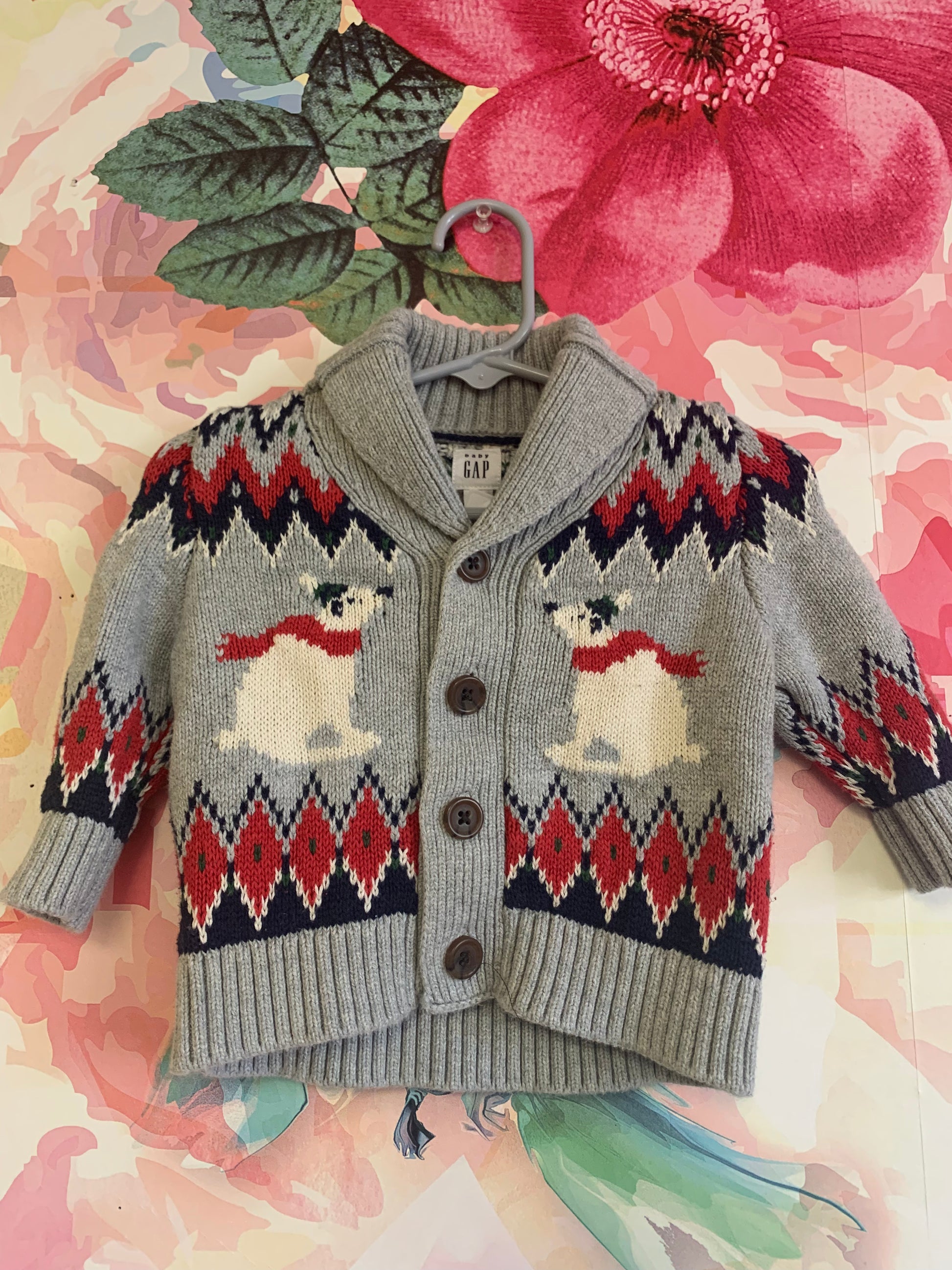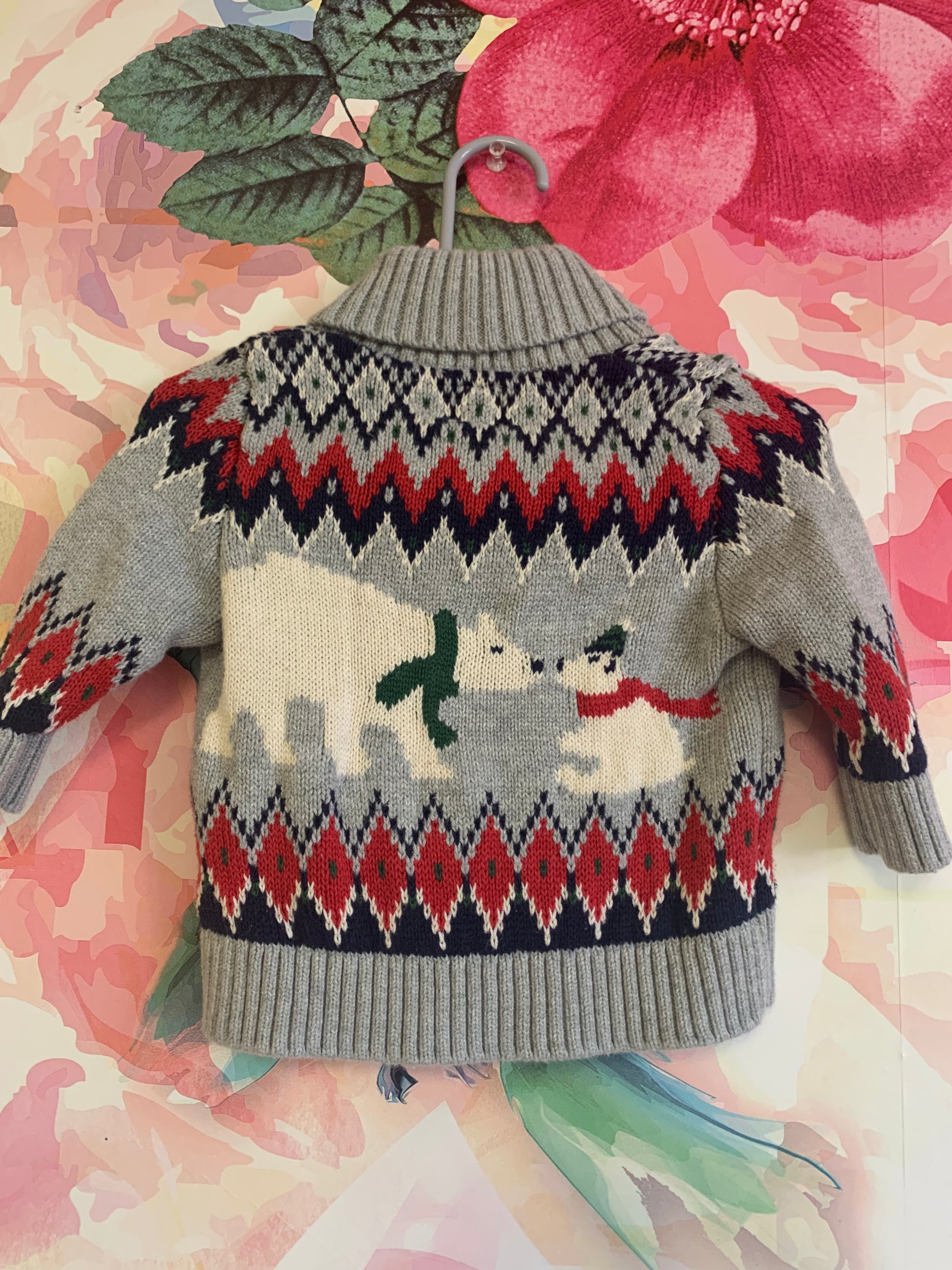 Baby Gap grey knit cardigan sweater with polar bear winter scene. Size 3-6m