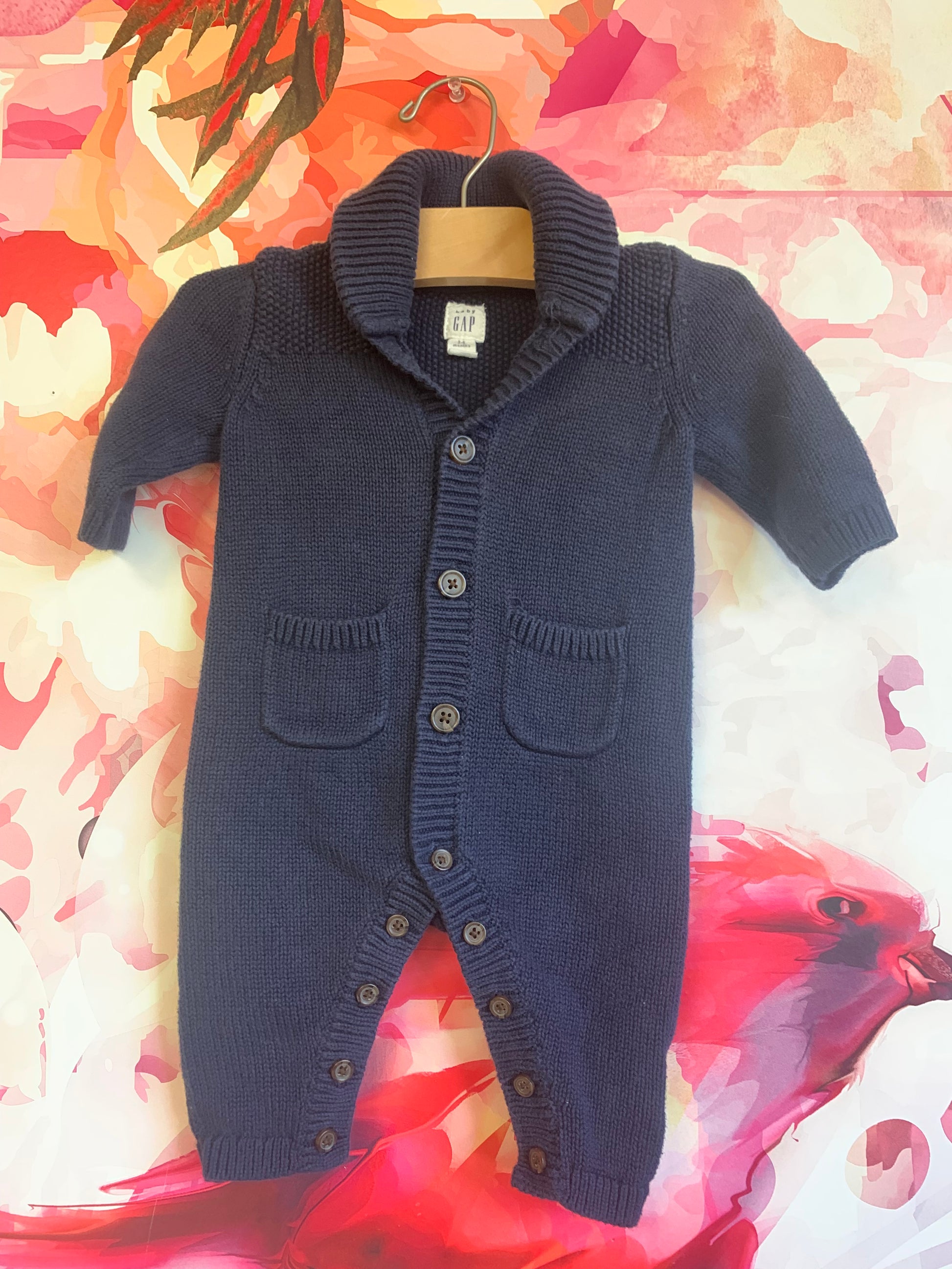 Baby Gap navy blue knit romper with cowl neck and buttons. Size 3-6m