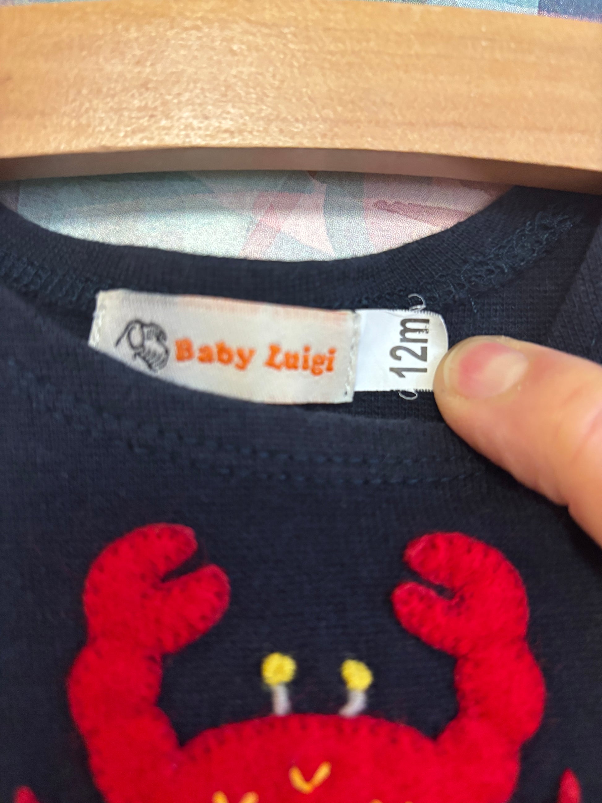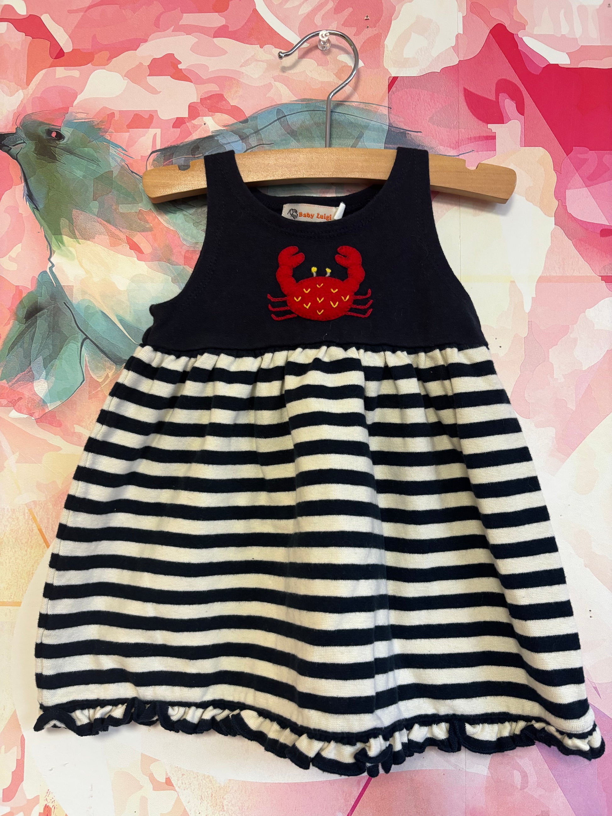Baby Luigi navy blue dress with blue/white stripes and red crab. Size 12m