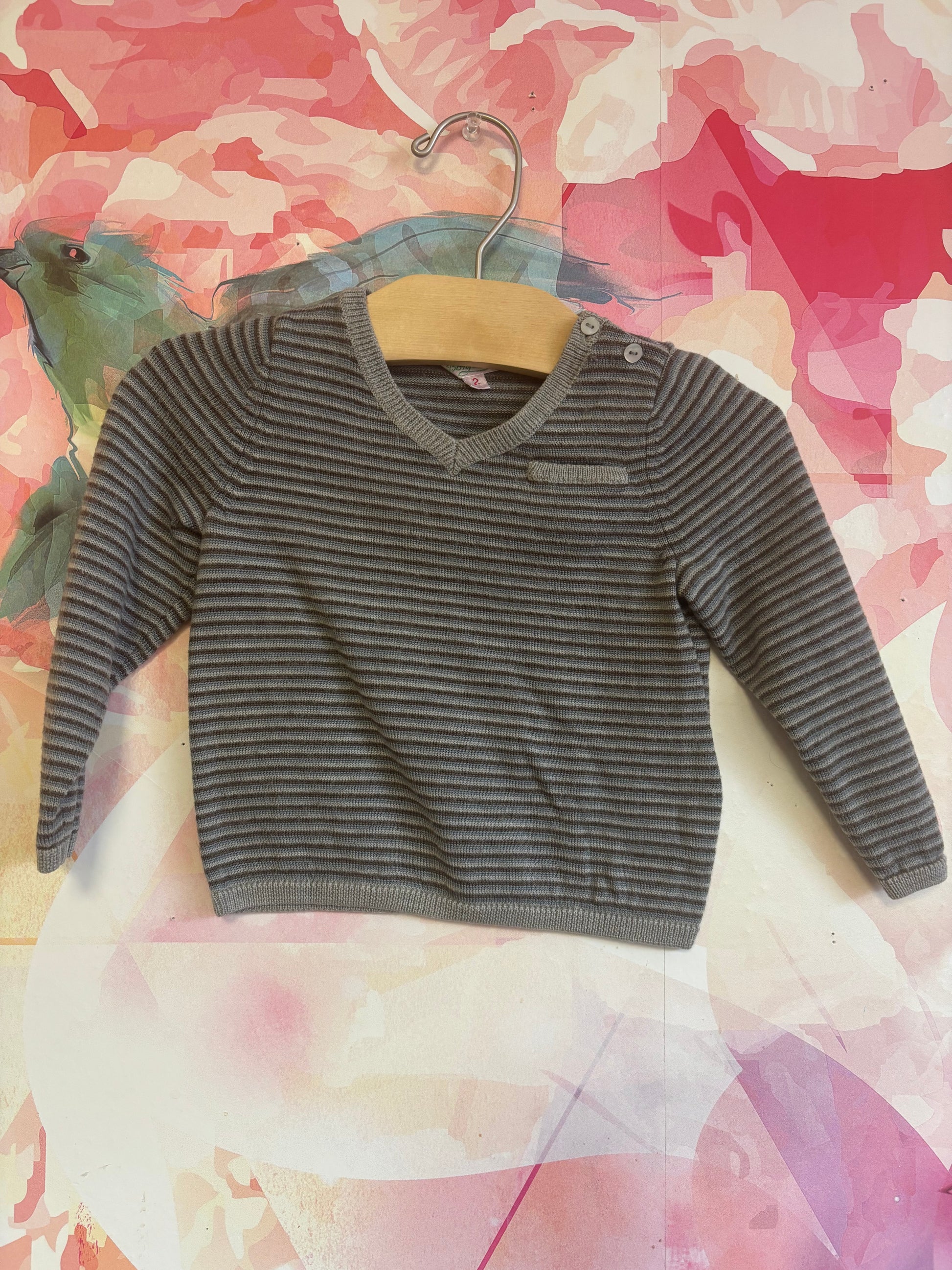 Bonpoint stripe grey & blue V-neck sweater with two shoulder buttons. Size 2T