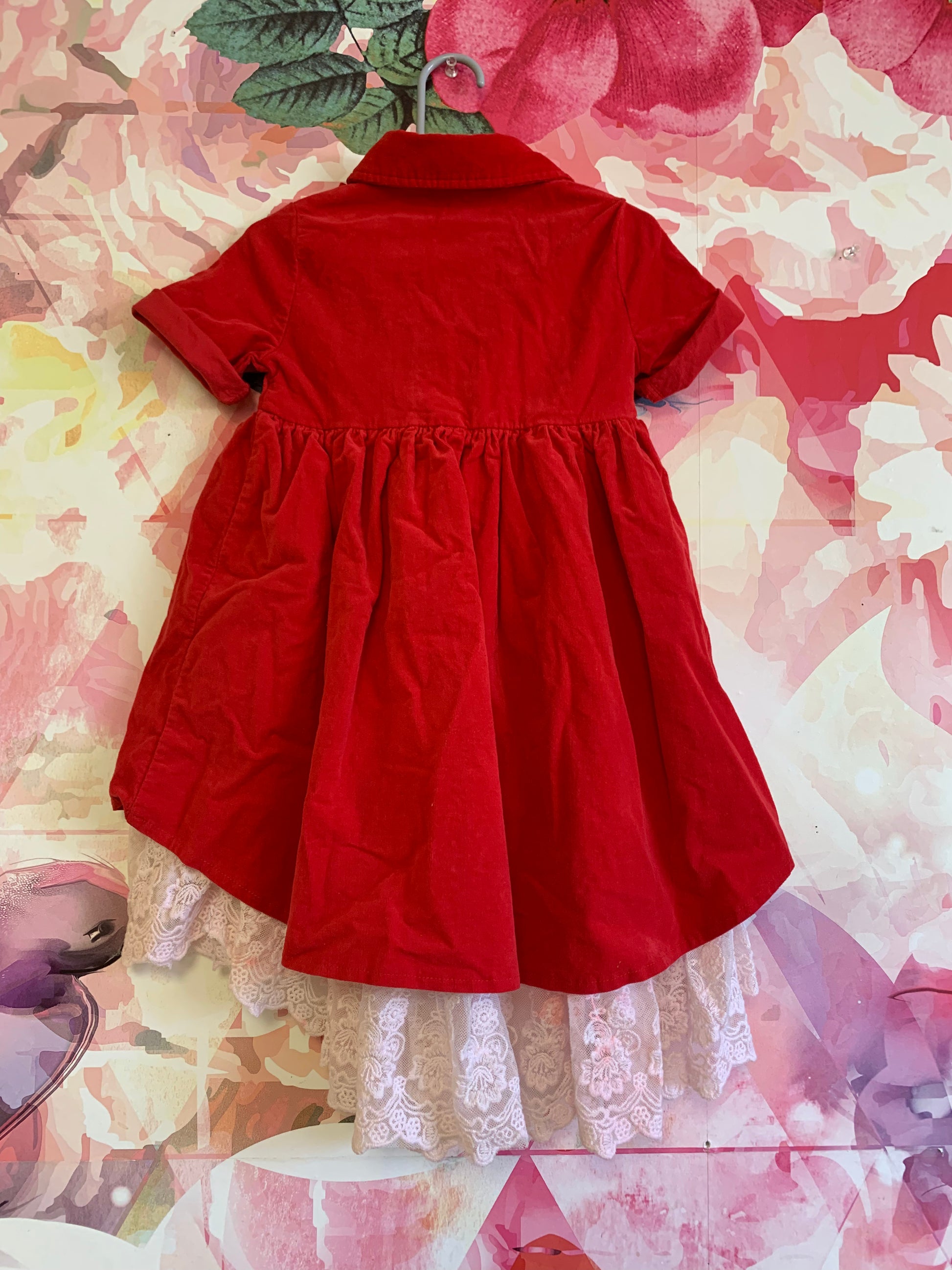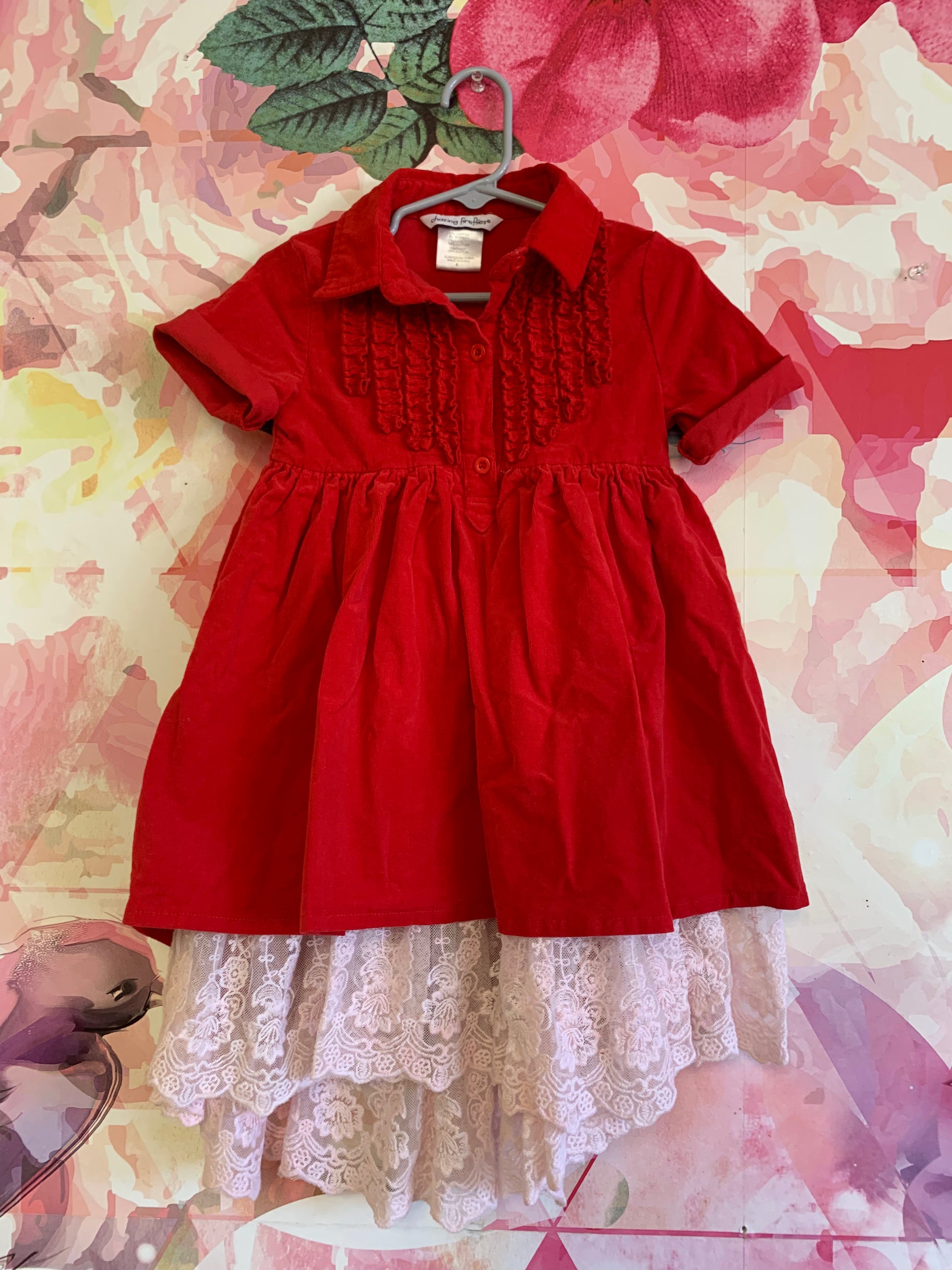 Chasing Fireflies red velour short sleeve dress with ruffles and white lace exposed on bottom. Size 4T