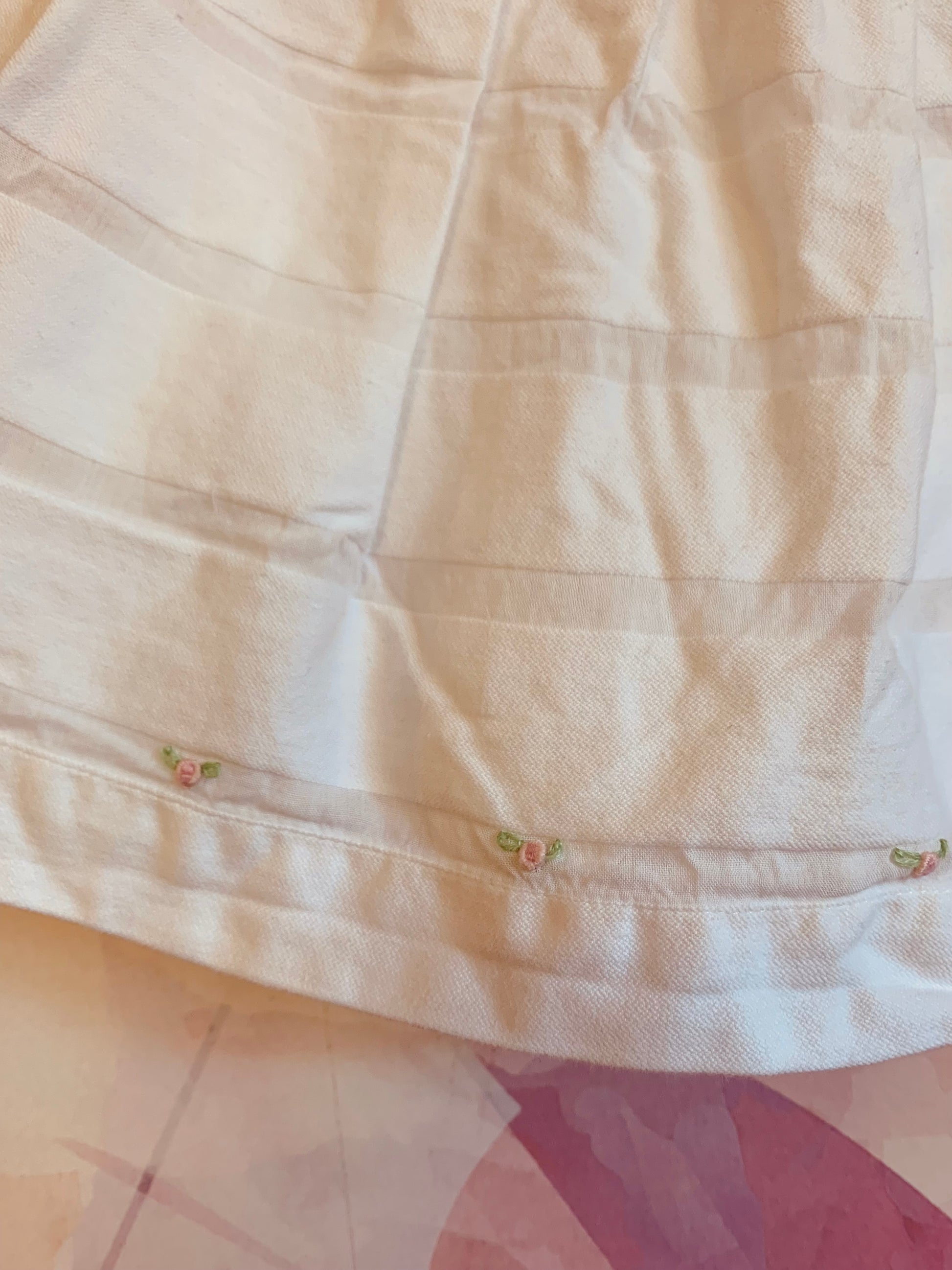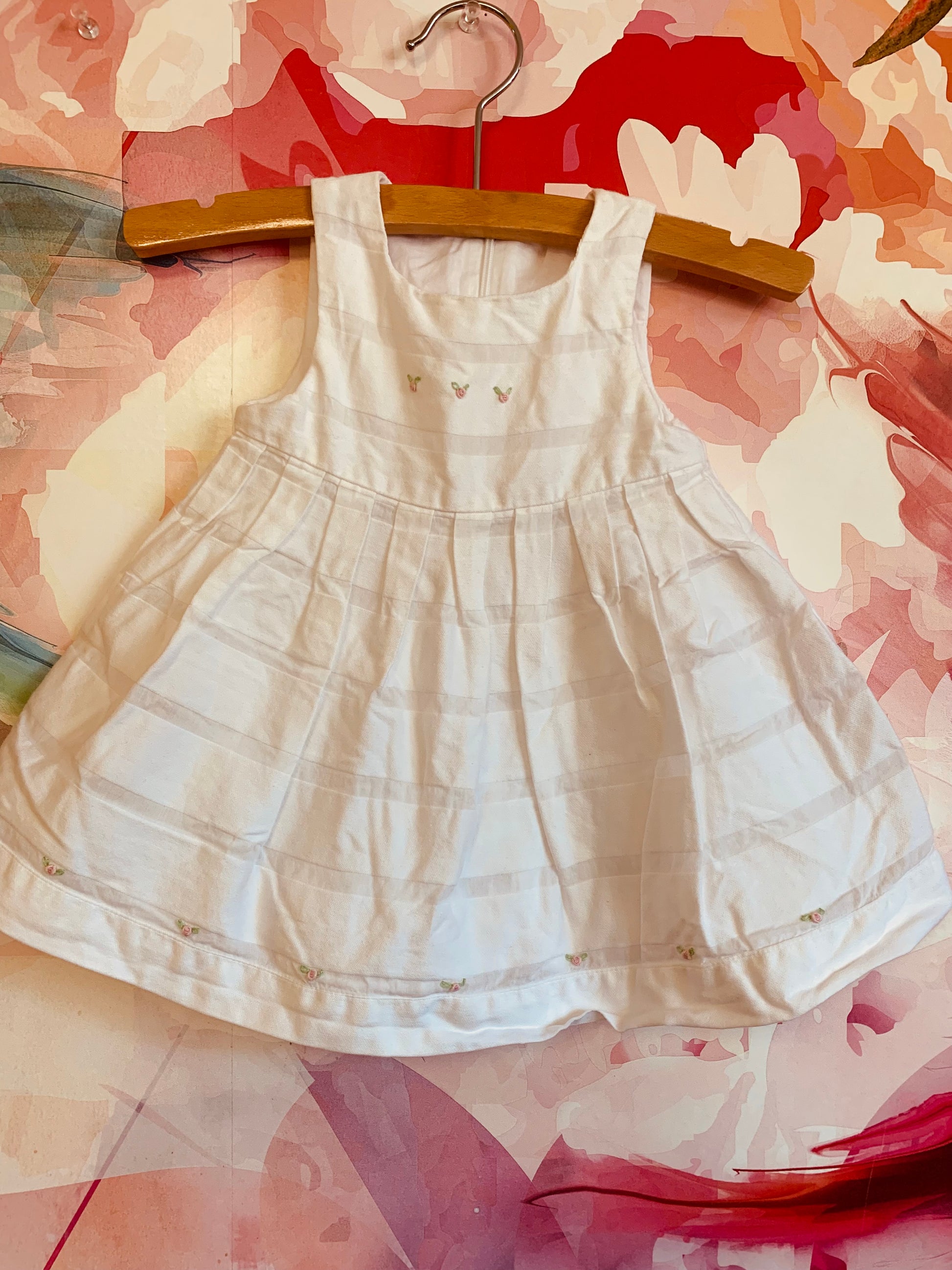 Ciccino white baby dress. Italian brand. 100% cotton. Pleats & tiny pink flowers on neck and front hem. Size 9m.