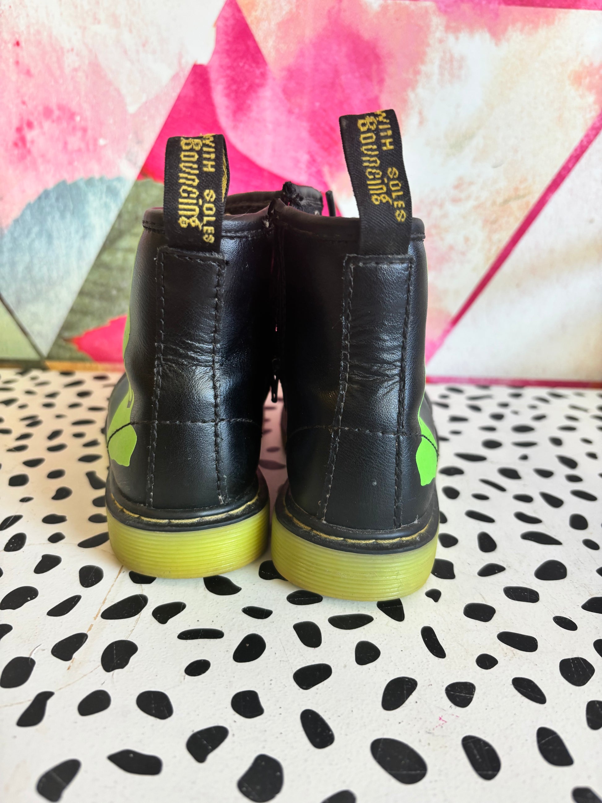 Doc Martens black leather boots with glow in the dark neon green skeleton foot bones. Size 10L.