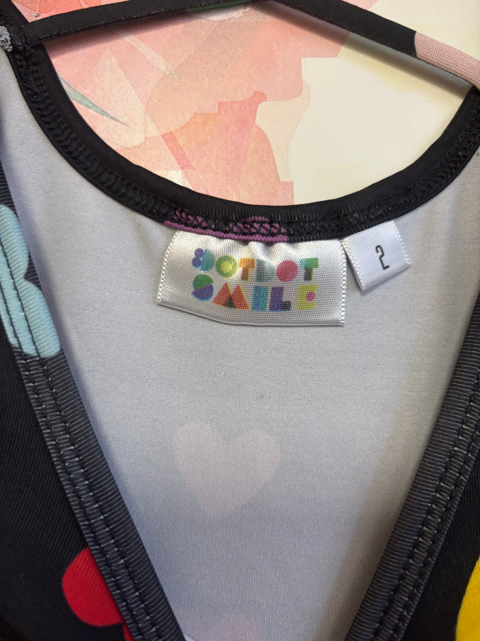 Dot Dot Smile black short sleeve swing dress with rainbow hearts and criss cross back. Size 2T.