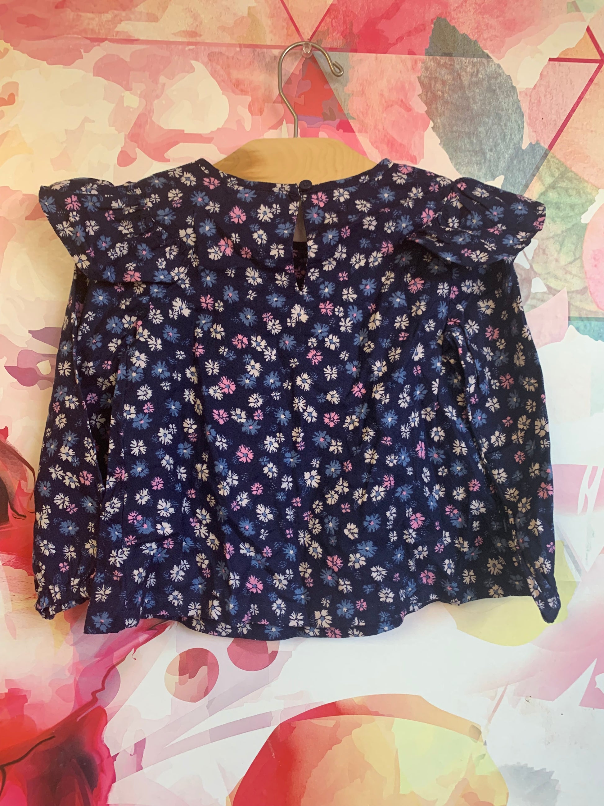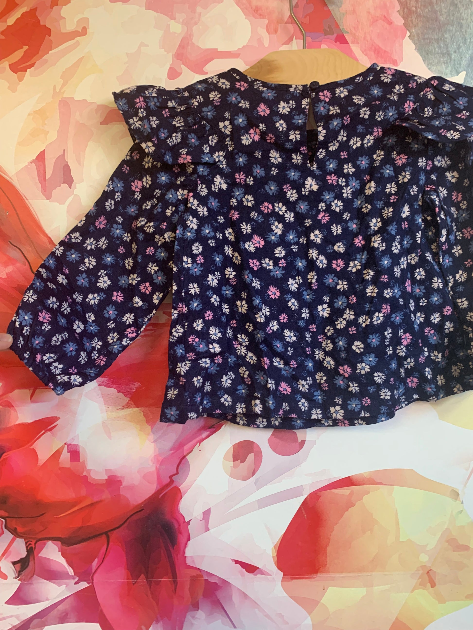 Gap navy blue long sleeve top with pink, white, blue flowers. Size 3T