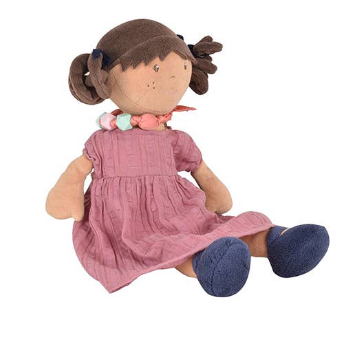 Mandy is a soft doll wearing a muslin dusky rose dress and beautiful necklace which a child can remove and use as a bracelet. She has matching blue shoes and ribbons in her hair.