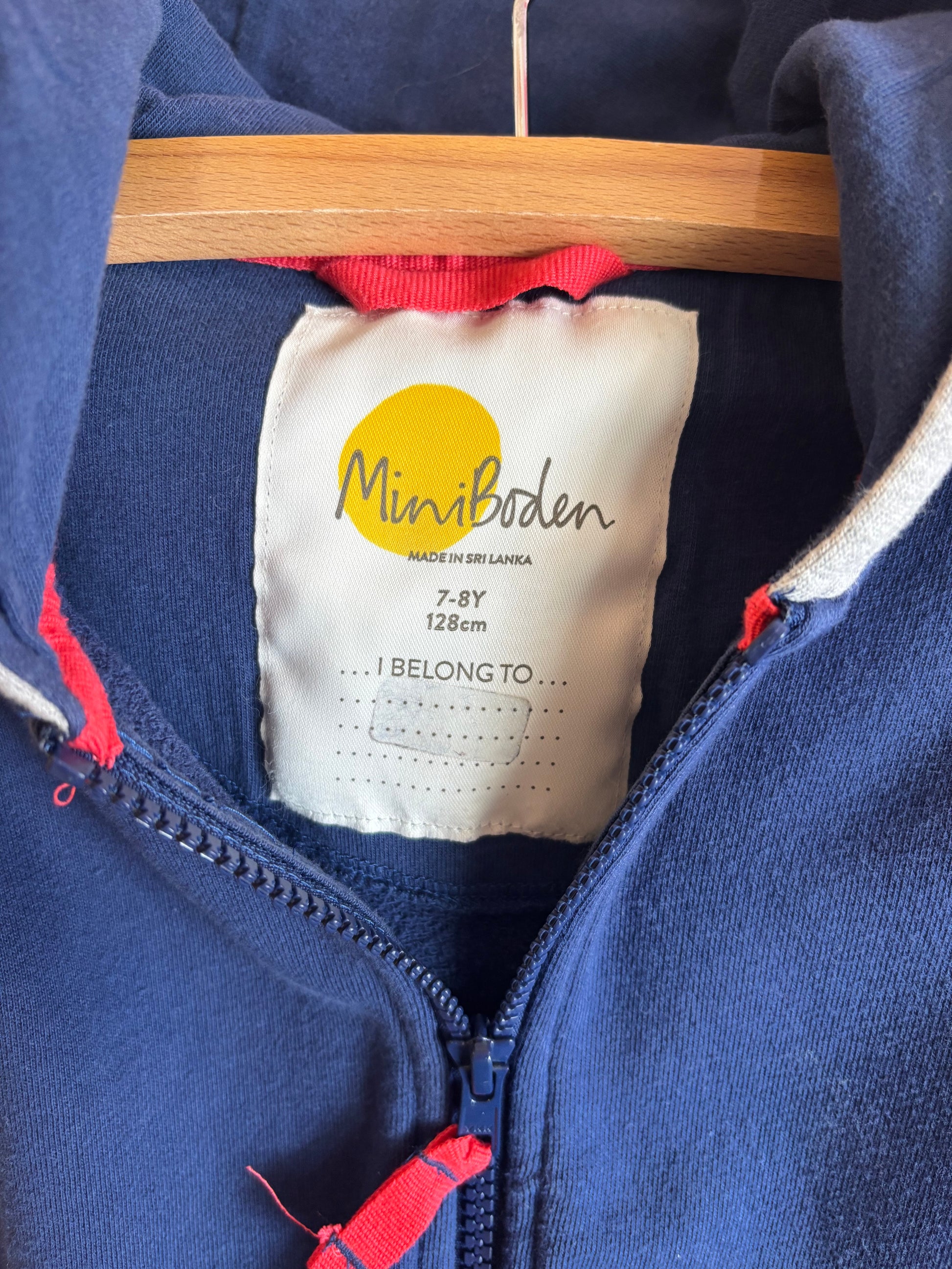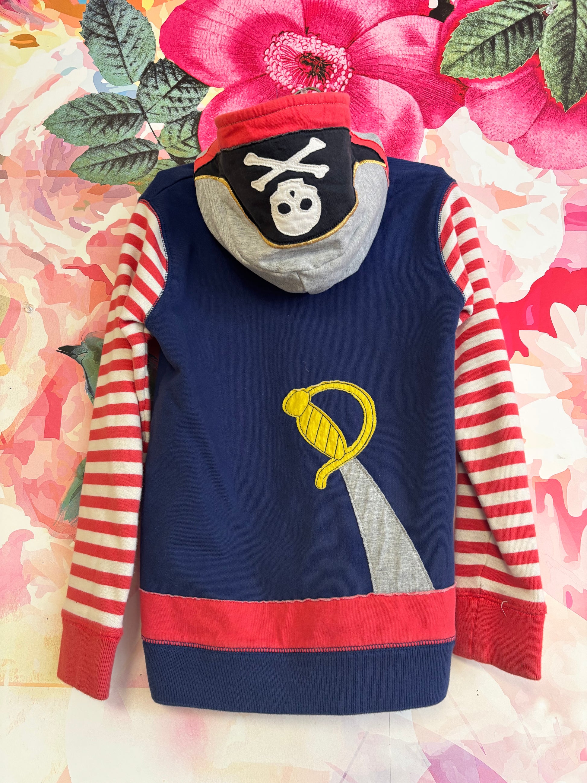 Mini Boden blue zip up pirate hoodie with red/white stripe sleeves, sword on back. Size 7T.