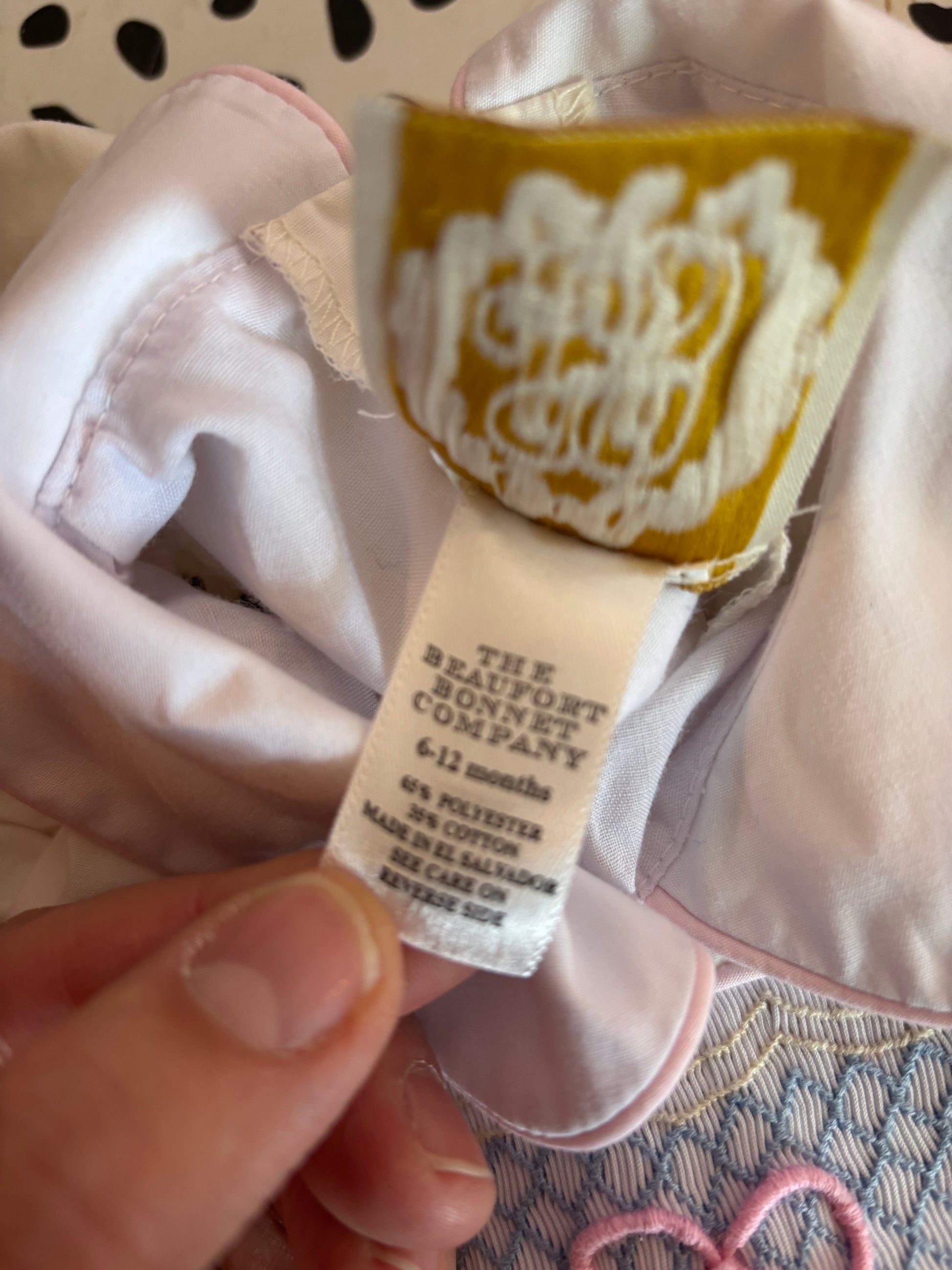The Beaufort Bonnet Company white short sleeve dress. Blue & pink bow and pink hem. Size 6-12m